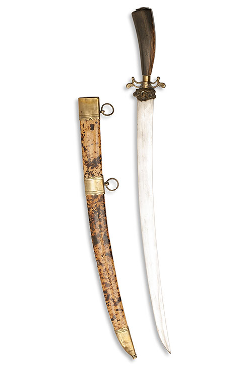 A FRENCH HUNTING HANGER, 19th century, with 15 3/4in. curved single-edged blade, brass hilt cast and chased with pierced scrollwork, faceted tapering horn grip, in original brass-mounted scabbard with imitation tortoise-shell veneered body (veneer cracking).
