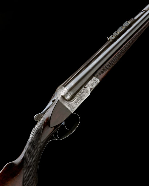 26 1/8in. nitro barrels with matt sight rib, open sights and four folding leaf sights marked in gold 200, 300, 400 and 500 with ramp-mounted bead fore-sight, the tubes engraved and inlaid 'RAICK FRERES. LIEGE. BELGIUM', the undersides engraved 'FOR KYNOCH .375 2 1/2" 40 GRS POWDER - 270 GRS SOLID BULLET', treble-grip action with removable striker discs, short side bolsters, automatic safety, floral and scroll engraving, brushed finish, 14 3/4in. well-figured pistolgrip stock with fluted horn pistolgrip-cap and including 3/4in. rubber recoil pad, small crack to fore-end wood, weight 6lb. 12oz.