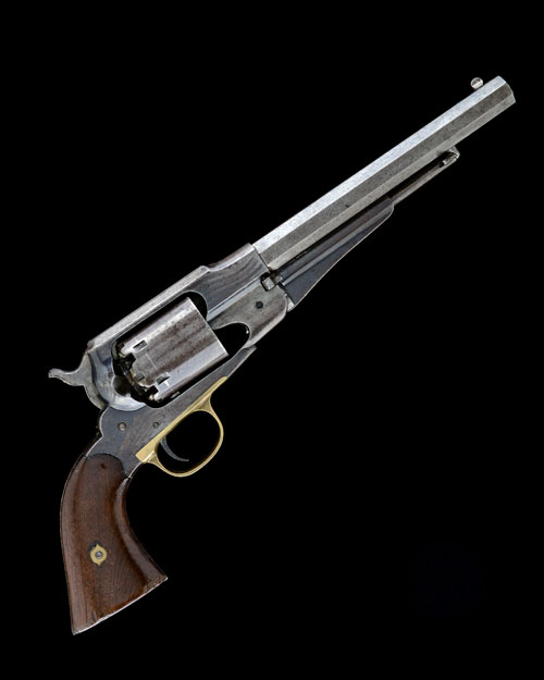 circa 1866, with blued 8in. octagonal barrel, the top-flat signed 'PATENTED SEPT 14 1858' over 'E. REMINGTON & SONS, ILION NEWYORK U.S.A.' over 'NEW-MODEL', solid frame, plain cylinder, brass trigger-guard, smooth two-piece walnut grips, traces of finish
