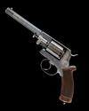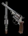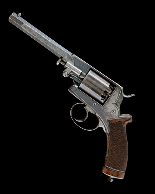 circa 1855, most probably a Belgian licenced copy, with blued 6 1/2in. barrel, the top-strap inlaid in silver 'GENSDARMERIE GOTHA', dove-tailed fore-sight, standing notch rear-sight with engraved panel behind, plain cylinder, solid borderline engraved frame, chequered one-piece walnut grip with floral border carved to the top and borderline to the base, provision for lanyard ring at heel and side-mounted 'Kerrs patent' rammer to left of barrel, strong traces of finish throughout