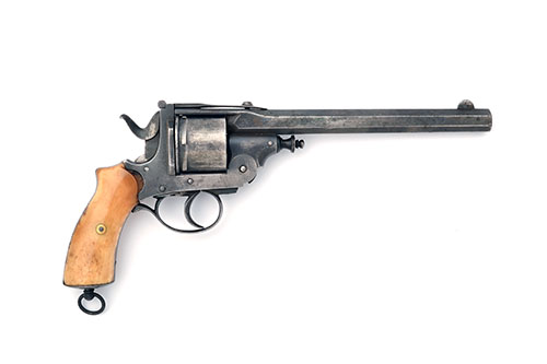 circa 1875, of Montenegrin type, with octagonal 8in. barrel, crescent fore-sight, standing notch to the rear of the closure catch spring, plain cylinder with ratchet locking, full ring type ejector, break-open frame, smooth bone grips and lanyard ring to pommel