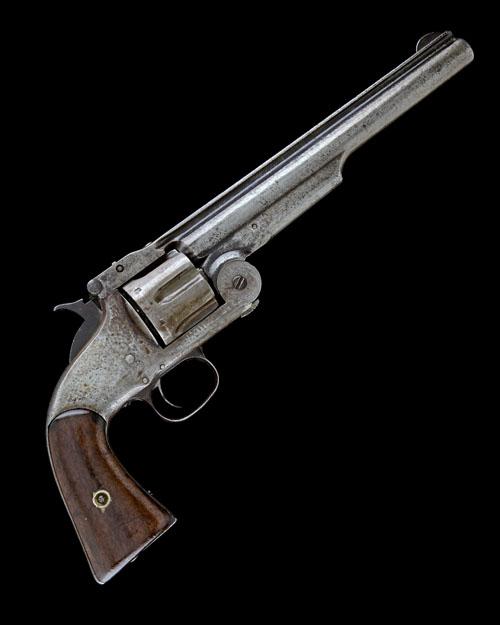 with 8in. barrel, raised sighting rib signed by the maker and with patent dates to August 1869, fluted cylinder, break-open frame and smooth walnut grips, the whole badly worn with some external pitting and possible small replacement parts