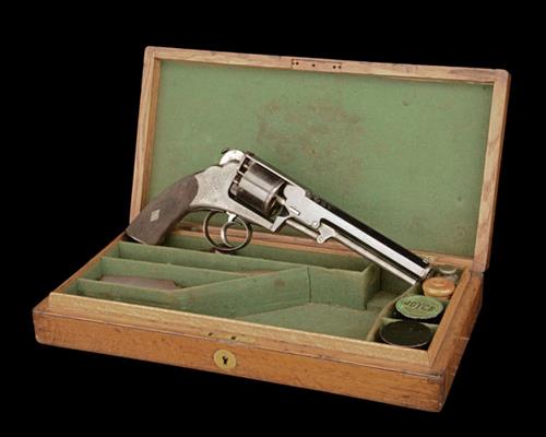 circa 1855, with blued octagonal 6in. barrel, dove-tailed blade fore-sight, radiused muzzle, scroll engraving to the breech, the border engraved top-strap signed 'ADAMS LONDON' (top-strap cracked), standing notch rear-sight to top of frame, plain blued cylinder with moulded band to the leading edge, borderline and scroll engraved frame, spurless hammer fitted with 'Bentley's safety', chequered walnut grips, guarded double-action only trigger and articulated rammer mounted to the under-side of barrel, a good amount of original finish remaining; COMPLETE WITH its manufacturer's mahogany storage case, compartmented and lined in green baize and containing a number of original accessories including a cleaning rod, nipple-key, powder-flask, oil-bottle, nipple-pot, lubricating and cap-tins together with an unassociated possibly reproduction 54-bore brass bullet-mould