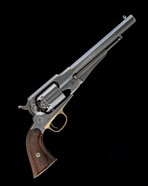 circa 1865, with blued 8in. octagonal barrel, the top-flat signed 'PATENTED SEPT 14 1858' over 'E. REMINGTON & SONS, ILION NEWYORK U.S.A.' over 'NEW-MODEL', solid frame, plain cylinder, brass trigger-guard, smooth two-piece walnut grips, the left cut with four notches and an inlet repair, refinished throughout
