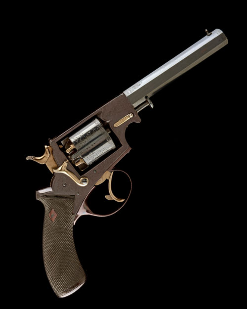 possibly also being the date and possibly the work of Francotte of Liege, with octagonal 6in. barrel, engraved band at muzzle, scroll engraving to the breech, border and scroll engraved top-strap with vacant banner to centre, plain cylinder with engraved band around leading edge and scroll engraved panels over each chamber, borderline and scroll engraved frame, engraved back-strap and pommel-cap, chequered walnut one-piece grip, scroll engraved trigger-guard bow and fitted with a Brazier-style rammer to the left side of barrel, the whole refinished with slight loss to engraved detail