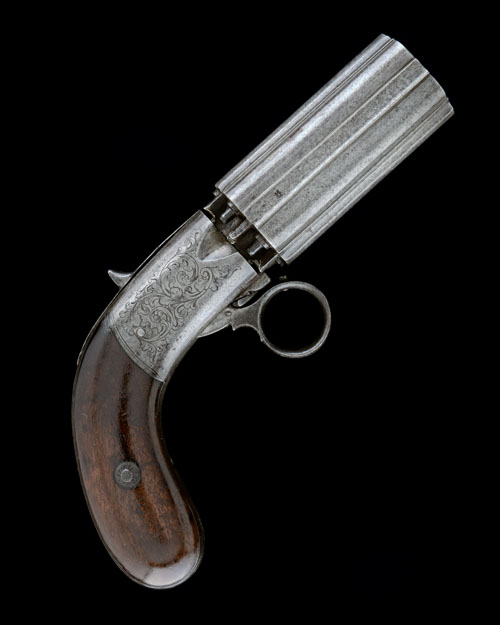 AN 80-BORE PERCUSSION SIX-SHOT PEPPER-BOX REVOLVER SIGNED 'J.R. COOPER'S PATENT', no visible serial number,