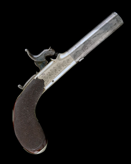 circa 1840, with deeply rifled 2 3/4in. turn-off round barrel (traces of finish), engraved band to muzzle, round white-metal scroll engraved boxlock action signed 'DOBSON, LOUTH', colour-hardened central dolphin-headed hammer (good colour), sliding safe to the top-tang, chequered walnut bag-shaped butt, white-metal oval escutcheon to wrist and engraved white-metal butt-cap, concealed blued automatic trigger