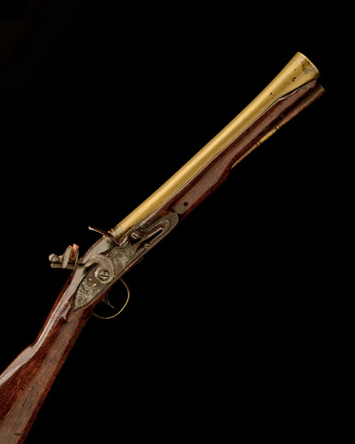 English circa 1790, with flaring 12in. barrel, private proofs, moulded band at breech, squared iron top-tang, flat iron lockplate (corroded) with bridle-less frizzen, walnut full-stock (small losses to fore-end, cracks), brass furniture and associated ramrod
