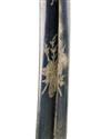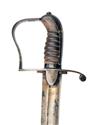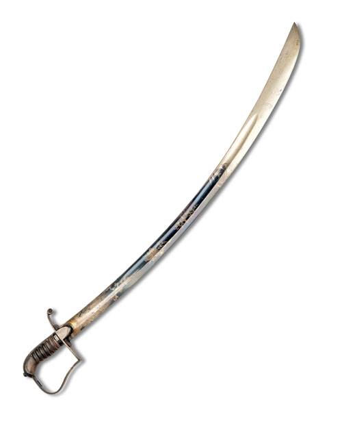 circa 1810, with curved clip-point fullered 33in. blade, the first three-fifths of both sides with a blued background and gilded motifs of flowers and trophies (left side faded), one side also featuring a cavalryman in period dress wearing a 'Tarleton' helmet, iron stirrup hilt with turned down quillion and applied broad langets, curved back-strap (old brazed working repair) and wire-bound leather grip, missing scabbard