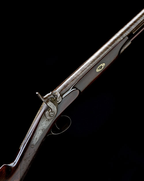 circa 1850, with triple-staged 20 1/2in. twist-iron barrel (35 1/4in. overall), borderline and scroll engraved back-action lock, walnut half-stock chequered at the wrist, iron furniture and original brass-mounted ramrod, exposed iron surfaces lightly worn