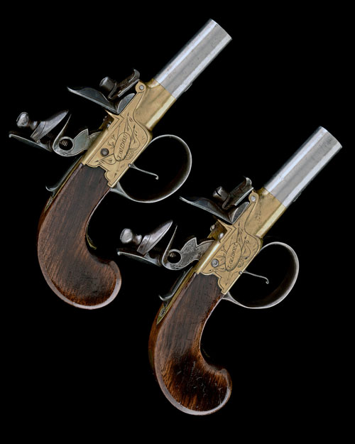 HILL, LONDON A PAIR OF 50-BORE FLINTLOCK BRASS-BODIED TURN-OFF POCKET-PISTOLS, no visible serial numbers,