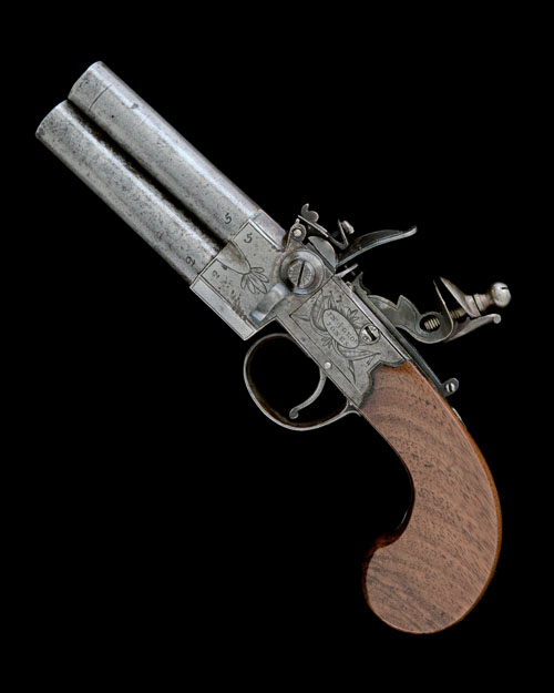 circa 1800, with round turn-off iron 2 3/4in. barrels, false rifling at the muzzles, squared London proofed borderline and trophy engraved action signed in central oval panels 'JNO & GEOE JONES' (sic) on the left and 'LONDON' on the right hand side, swinging tap lever to the left hand side, central hammer with rain-proof pan, sliding safe to the top-tang, guarded trigger and slab-sided walnut butt