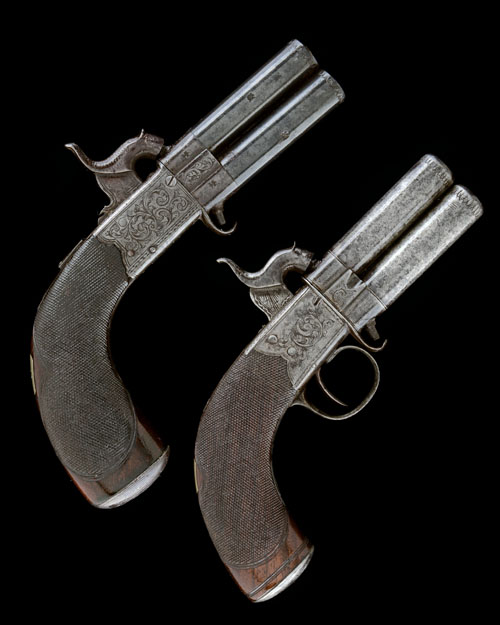 circa 1845, with Birmingham proved 2in. barrels, engraved bands and falsely rifled at the muzzles, scroll engraved radiused actions, signed on the top-strap 'N.W. HANSON DONCASTER', chequered walnut butt with trap to heel and guarded trigger