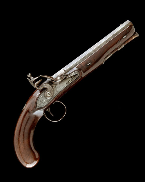 circa 1790, with octagonal 8in. barrel, small applied blade fore-sight, standing notch rear-sight to the engraved top-tang, border engraved lock with further floral engraving to the tail and hammer and signature (rubbed) forwards of the hammer, walnut full-stock with smooth bag-shaped butt, twin escutcheon-less barrel-keys and original wood ramrod (old repairs to cracks in fore-end)