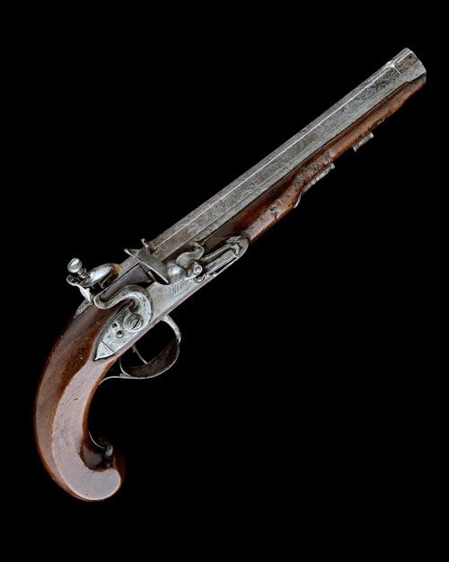 circa 1795, with possibly slightly shortened 8in. octagonal damascus barrel, the top-flat signed in script 'LONDON', bead fore-sight in a silver star background, engraved bead band and standing notch rear-sight to the breech-end, engraved top-tang, flat bevel-edged step-tailed lock signed forwards of the hammer in script 'BLAIR', large roller to the frizzen-spring, walnut full-stock with slab-sided butt, iron furniture including pillar-fronted trigger-guard bow, pineapple finial and ramrod pipes, missing ramrod, stock broken through and repaired through rear side-nail, dents losses and repairs to fore-end tip