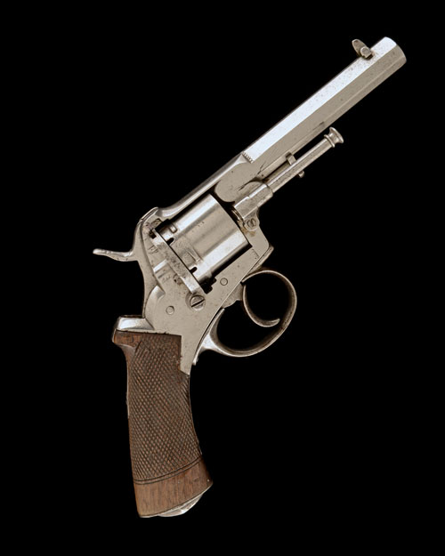 circa 1860, with octagonal 4in. barrel, the top-flat signed 'SYST. LEFAUCHEAUX', dove-tailed blade fore-sight, notch rear-sight, solid frame with pull-back loading gate, plain cylinder with ratchet indexing, spurred hammer, chequered walnut grips with moulded iron grip-cap, guarded trigger, the whole cleaned and in the white (action at fault); TOGETHER WITH a period full flap leather holster signed 'ALEX MARTIN, GLASGOW'