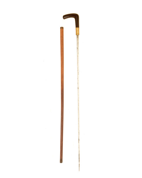 the narrow 28 1/2in. blade of triangular form, both sides etched with small floral designs spaced apart for the first third of the blade, later replacement hilt with brass bolster (cleaned), horn walking-stick handle and original cane scabbard with engraved brass band at socket and iron reinforcement at tip (worn through)