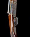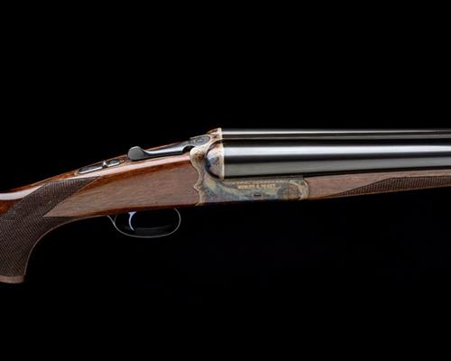 30in. nitro barrels with raised matt rib, 3in. chambers, multichokes, scroll-back action, automatic safety, non-selective single trigger, partially engraved with acanthus scrolls, the makers name inlaid in gold, retaining virtually full original colour-hardening and finish, 14 7/8in. pistolgrip stock, weight 7lb. 10oz.