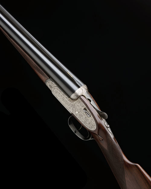 25in. nitro chopperlump barrels with Churchill-rib, 2 3/4in. chambers, bored approx. imp. cyl. and 1/4 choke, removable striker discs, automatic safety, hand-detachable lockplates, gold-inlaid cocking-indicators, articulated front trigger, rolled-edge triggerguard, fully engraved with acanthus scroll and floral designs, bright and blued finish, 14 5/8in. stock, weight 6lb. 7oz.