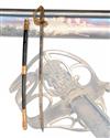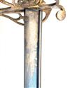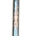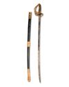 circa 1830 with 32 1/2in. slightly curved pipe-backed blade and quill tip, the first half of the blade with gilded floral motifs, urns and trophys on a blued ground with arabesque terminal, makers details to the forte, gilded three-bar 'gothic' hilt with cypher of George IV (hilt miss-shapen, losses to gilding), folding pierced inner guard, wire-bound sharkskin grip and gilded back-strap with integral pommel (rubbed), complete with its brass-mounted black leather scabbard, the throat marked 'DEAKIN'S PATENT' (leather renewed)