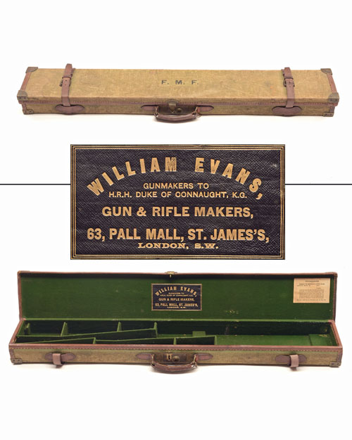 fitted for 43in. rifle, the interior lined with green baize, with a leather gold-tooled William Evans trade label, brass lock (including key), the lid exterior with the monogram 'F.M.F.'