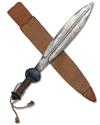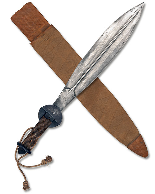 circa 1916, with substantial leaf-shaped 17 1/2in. blade, approximately 3in. wide at its broadest, with carved central reinforcing rib flowing into the ricasso, one side stamped with a small 'JOUBERT & CIE' trademark, the other with a 'JO' monogram and inscribed 'DROS URDDAS CYMRU' (for the dignity of Wales), folding stepped circular iron cross-guard, rope-bound hilt, flattened oval integral pommel with skull-cracker spike and rope lanyard (some cleaning and frosting to blade); TOGETHER WITH its webbing bound leather scabbard with reinforced tip and leather belt-loop (belt loop broken through)