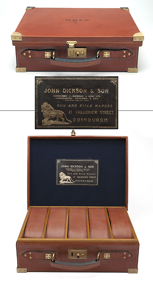 for approx. 250 cartridges, the lid interior lined with blue baize, with a leather gold tooled John Dickson & Son trade label, five leather lifters, four oak removable dividers, brass lock (key missing), the lid exterior with the monogram 'MHJW'