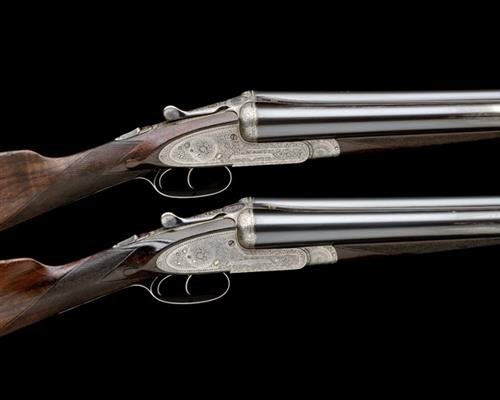 30in. nitro reproved barrels, sunken ribs engraved 'HOLLAND & HOLLAND, 98 NEW BOND STREET. LONDON.', and gold-inlaid '1' and 2', 2 1/2in. chambers, bored approx. true cyl. and imp. cyl. choke, wall thicknesses below recommended minimum, toplevers gold-inlaid '1' and '2', automatic safeties with gold-inlaid 'SAFE' details, gold-inlaid cocking-indicators, the actions, lockplates and furniture finely engraved with acanthus scrollwork and floral bouquets with decorative bordering, the lockplates with false stepped tails, the undersides with oval cartouches inscribed 'ROYAL HAMMERLESS PATENT EJECTOR', retaining traces of original colour-hardening and finish, 14 3/8in. figured stocks (No.1 with small wood plugs, No.2 minor damage to underhorns), horn buttplates, weight 6lb. 7oz., in their brass-cornered oak and leather case with leather lined interior and leather internal protecting flap, the lid exterior with circular brass escutcheon engraved 'R.V. TOYNBEE. RIFLE BRIGADE'