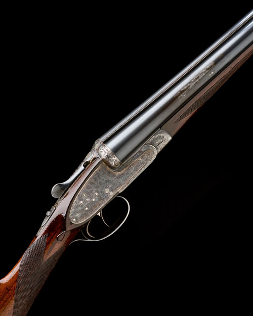 26in. nitro barrels, 2 3/4in. chambers, bored approx. 1/4 and 1/2 choke, engraved arcaded fences, removable striker discs, automatic safety, gold-inlaid cocking-indicators, rolled-edge triggerguard, acanthus scroll engraving, retaining some original colour-hardening and finish, 14 1/4in. stock, weight 6lb. 6oz.