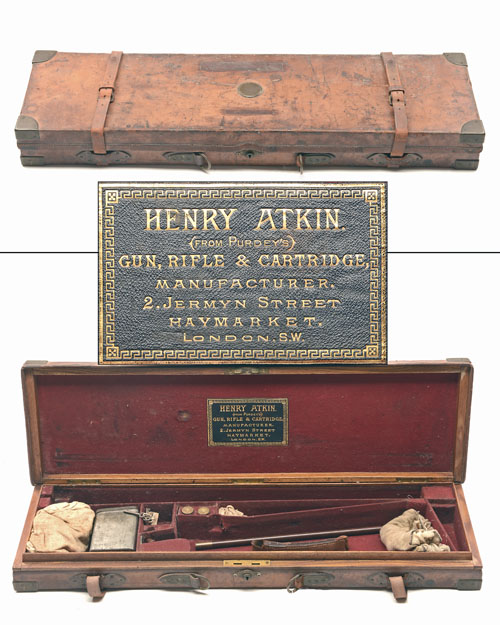 fitted for 28in. barrels (could adapt to 30in.), the interior lined with red baize, with a leather gold-tooled Henry Atkin trade label, central brass push-button lock (key missing), the lid exterior with a blank brass escutcheon, handle detached