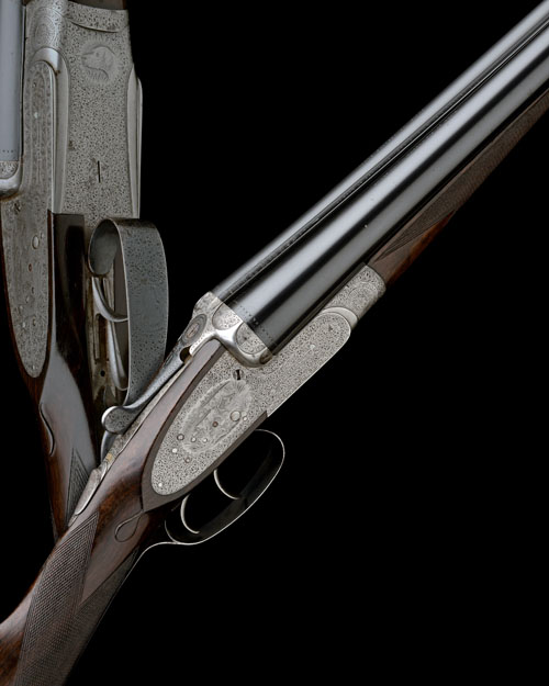 28in. Whitworth-steel nitro reproved barrels (slight movement on action), rib re-engraved 'W.J. JEFFERY & CO. 13. KING STREET. ST. JAMES'S ST. LONDON.', and '1', the tubes 'MADE OF SIR JOSEPH WHITWORTH'S FLUID PRESSED STEEL', 2 1/2in. chambers, bored approx. 1/4 and 1/2 choke, treble-grip action with hidden third bite, arcaded fences, toplever engraved '1', automatic safety with gold-inlaid 'SAFE' detail, fine acanthus scroll engraving surrounding oval vignettes of setters and pointers, the underside with a portrait of a labrador, the triggerguard with a spaniel, brushed finish, 14 7/8in. well-figured stock (small crack left underhorn), weight 6lb. 10oz.