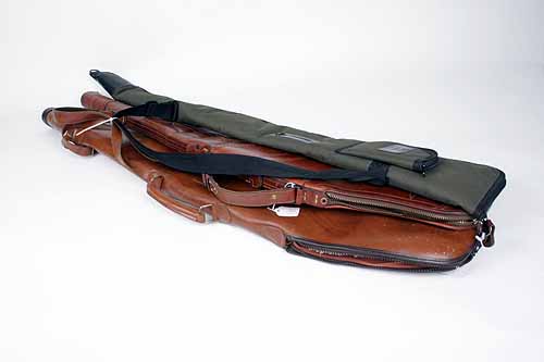 A LEATHER DOUBLE GUNCASE, fitted for 29in. barrels, the interior lined with green baize, brass lock (key missing)