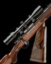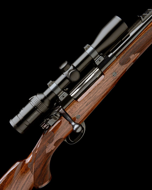 25 1/2in. nitro barrel, sight rib engraved 'J.P. SMITHSON GUNMAKER', open sights and two folding leaf sights with gold-inlaid sight lines and marked 100, 200 and 300, ramp-mounted bead fore-sight, receiver mounted with a Swarovski Z3 3-9x36 telescopic sight in quickly-detachable mounts, engraved recoil blocks, hinged floorplate with push button release, blacked finish, highly-figured pistolgrip stock with cheekpiece, fleur de lys chequering, sling eyes, pistolgrip-cap, darkwood finial, 14in. pull including 1in. rubber recoil pad