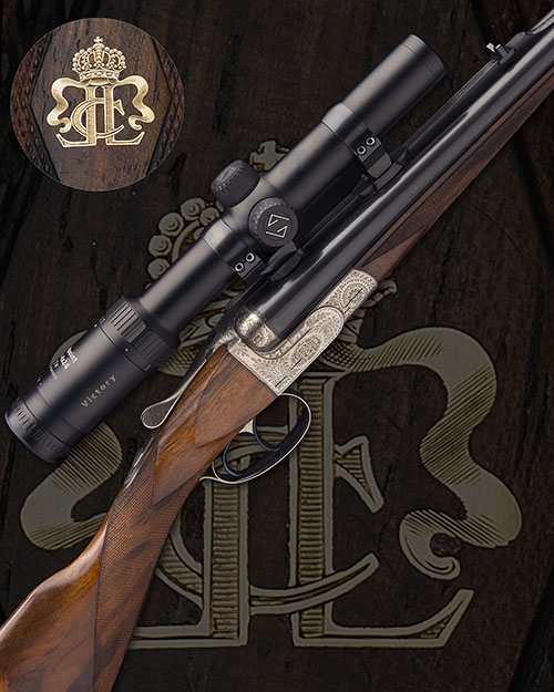 24 3/8in. nitro barrels with scroll-engraved matt sight rib, open sights, scroll-engraved ramp-mounted bead fore-sight, the breech end mounted with a Zeiss Varipoint 1,1-4x24 T* telescopic sight in quickly-detachable mounts, the tubes engraved 'AUG. LEBEAU-COURALLY. ARMES DE GRAND LUXE A LIEGE', treble-grip action with hidden third bite, removable striker discs, short side-bolsters, automatic safety, articulated front trigger, fine engraving of acanthus scrollwork and floral bouquets, bright finish, 14 3/8in. figured stock including 3/4in. wooden extension and 1/2in. rubber recoil pad, fore-end inset in gold with the Lebeau-Courally crest, weight 8lb. 13oz., in its fitted canvas and leather case