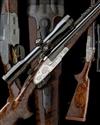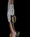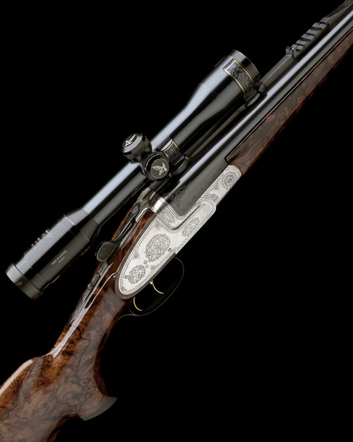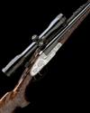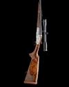 25 5/8in. Bohler Rasant-steel nitro barrels, raised matt sight rib tapering into a broad rib with banner engraved 'ALFRED W. MATHES - FRIEDRICHSDORF', open sights and three folding leaf sights, ramped bead fore-sight, the breech end mounted with a Swarovski Habicht 4x32 Nova telescopic sight in quickly-detachable mounts, engraved floral design to muzzle, treble-grip action with short side-bolsters, removable striker discs, hand-detachable lockplates with concealed flush release lever, cocking-indicators, gold-washed triggers, the front articulated, border engraving with floral bouquets, bright finish overall, the triggerguard blued and with gold line detailing, 15 3/8in. highly-figured burr walnut stock with cheekpiece, horn birdshead pistolgrip-cap, sling swivels, unchequered grip and fore-end, Deeley & Edge patent fore-end release, including 1in. rubber recoil pad, weight 11lb. 7oz.