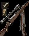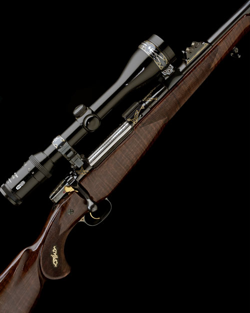 25 1/4in. nitro barrel with open sights and two folding leaf sights, ramp-mounted bead fore-sight with hood, the receiver mounted with a Meopta Artemis 2000 3-12x50 telescopic sight in quickly-detachable mounts, hinged straddle floorplate with push button release, gold-washed set trigger, blacked finish engraved with gold-highlighted geometric designs, gold-washed safety, screw heads and bolt details, the scope rings decorated en suite and with white metal inlaid stylised depictions of bow hunters, the floorplate relief engraved with a cape and head of a gemsbok, the fore-end inset with a relief engraved and gold-washed lion, the hand with gold-washed insets of foliate designs, sculpted figured pistolgrip stock with birdshead grip, sling swivels, 14 3/8in. pull including 1in. ventilated rubber recoil pad, in a Franzen full length alloy case