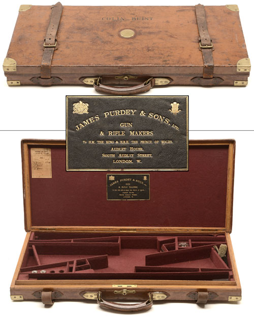 fitted for 27in. barrels, the interior lined with maroon baize, the lid with a leather gold-tooled James Purdey & Sons trade label, with a Charges For Gun label with serial No. 23301-2, central brass push-button lock (key missing), the lid exterior with 'COLIN BUST' and a brass escutcheon