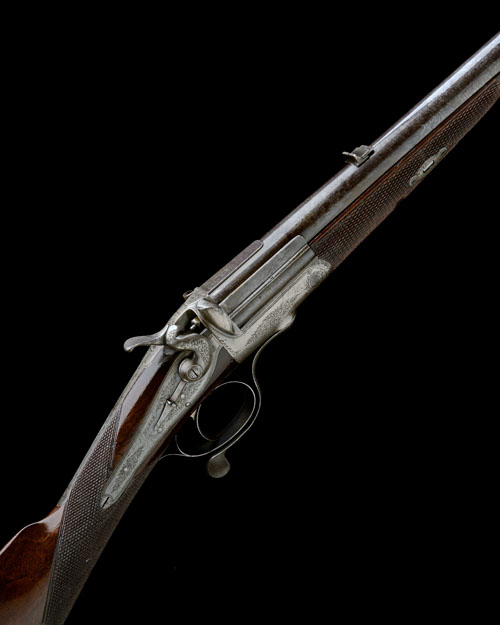 24 1/4in. black powder only bold damascus barrel, short sight flat, open sights with two folding leaf sights, bead fore-sight, 2 1/2in. chamber, Jones patent rotary-underlever, carved fences, non-rebounding back-action lock with bolted hammer, beader border and acanthus scroll engraving, 14 3/8in. stock including steel buttplate, weight 5lb. 1oz.