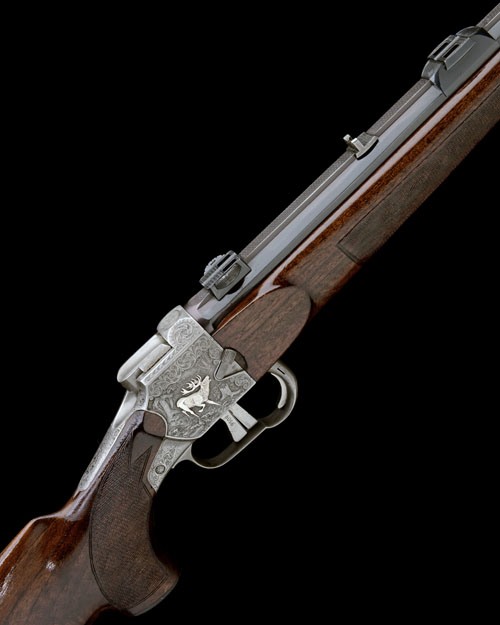 25 3/4in. Bohler Rasant-steel octagonal nitro barrel with raised matt top-rib, open sights, the breech end mounted with a Zeiss Diavari-Z 2,5...10x52 telescopic sight in quickly-detachable mounts, manual side safety lever, bold Germanic scroll engraving surrounding deeply carved woodland game scenes with silver-inlaid chamois and stag, old silver finish, 15in. pistolgrip stock including 3/4in. rubber recoil pad, weight 8lb. 14oz.
