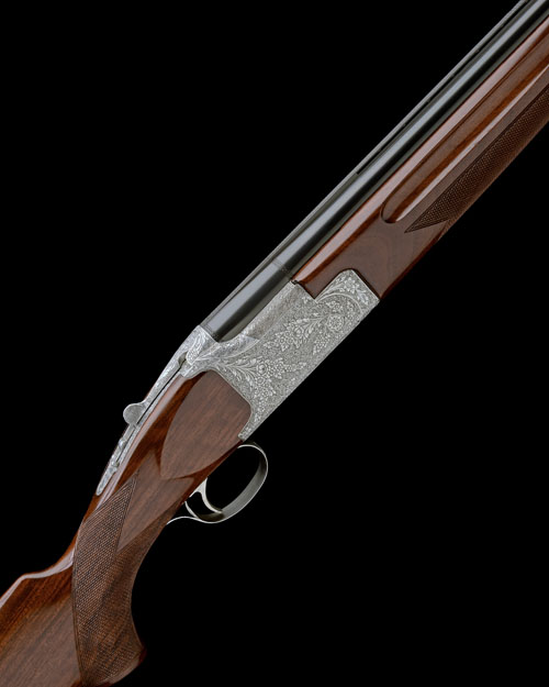 30in. nitro barrels with 6mm ventilated matt top-rib, 2 3/4in. chambers, bored approx. 3/4 and full choke, manual safety, the top tang fitted with barrel selector switch, the action and furniture profusely engraved with flowing acanthus scrollwork interspersed with foliate and floral motifs, silver finish, 14in. pistolgrip stock including 1/4in. rubber recoil pad, weight 6lb. 15oz., in a universal case