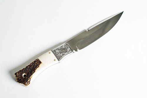 recent, with 6in. clip-point blade false edged for the last 3 3/4in., the ricasso pieced with two 'Spanish' notches, the back of blade with one, the front bolster fully scroll engraved and signed 'FARKA', smooth bone half-scales, the rear two thirds formed from natural stag horn pierced through with an aperture for a lanyard (no scabbard)