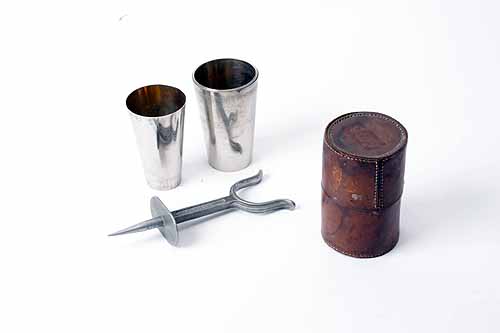 A SET OF STIRRUP CUPS, AN ALUMINIUM RIFLE REST