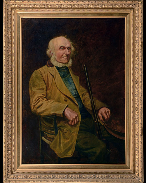 an original oil on canvas showing an elderly man with his sporting gun, signed by the artist, mounted in a gilt frame, measuring approx. 32in. x 23in.