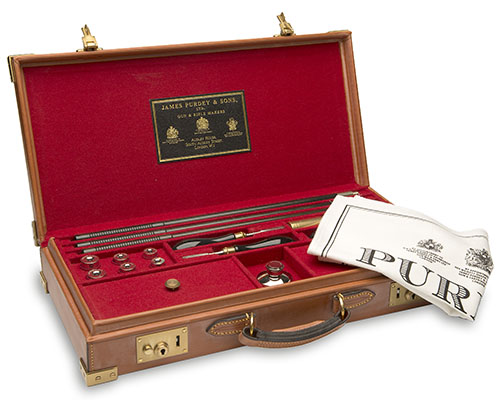 consisting of three cleaning rods, two brass chamber brushes for 12-bore and 20-bore, two turnscrews, an oil bottle, three pairs of nickel plated snap-caps for 28-bore, 20-bore and 12-bore, elegantly housed in a brass-cornered leather case, lined and sectioned with red baize, the lid interior with a leather gold-tooled James Purdey & Sons trade label,