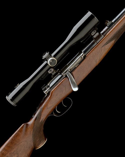 25 5/8in. nitro barrel, ramp-mounted bead fore-sight, folding leaf rear-sight, receiver mounted with a Carl Zeiss Diatal-D 6x42 telescopic sight with quickly detachable mounts, swept back butterknife bolt handle, tang safety, detachable box magazine, set triggers, 14in. figured pistolgrip stock with cheekpiece (including ventilated recoil pad), sling swivels