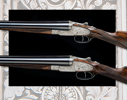28in. nitro chopperlump barrels, the tubes engraved 'HOLLAND & HOLLAND. BRUTON STREET, LONDON.' and the ribs gold-inlaid '1' and '2' and engraved '"ROYAL DE LUXE"' in script, 2 3/4in. chambers, bored approx. imp. cyl .and 1/2 choke (both), carved foliate fences, self-opening actions, toplevers gold-inlaid '1' and '2', automatic safeties with gold-inlaid 'SAFE' detail, gold-inlaid cocking indicators, hand detachable lockplates, rolled-edge triggerguards, the actions engraved with bold acanthus scroll set against a matt background surrounding vignettes of game in flight; No.1 with a brace of partridge on the left, the right with a brace of flushed pheasant, the underside with a mallard breaking from its naturalistic habitat, No.2 with a pair of partridge on the left, the right with game birds, the underside with a vignette of a woodcock in flight through a woodland vista, the vignettes all signed 'M.A. Hunt', silver finish, 15 1/2in. figured stocks, weight 6lb. 12oz. (No.1), 6lb. 11oz. (No.2), in their makers leather double motorcase