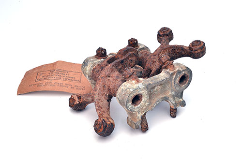 in excavated condition, with aluminium plain journals and adjustable rocker arms showing the engine had four valves per cylinder, London War Museum label