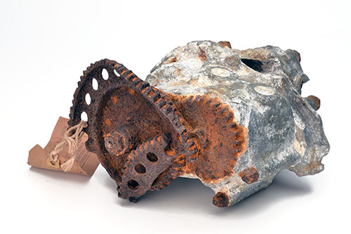 in excavated condition, listed as part of the propeller drive system but actually appears to house a pump (oil or coolant), with attendant gearing, museum label