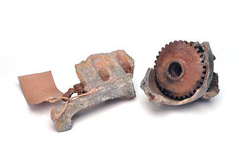 in excavated condition, the first an aluminium casting containing a steel bevel gear (possibly magneto drive) together with a small piece of engine casing & sump, with museum label