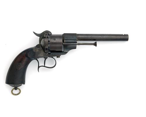 circa 1865, with blued round 6 1/4in. barrel signed on the top 'F LEFAUCHEUX, BRTE. PARIS' (indistinct), provision for fore-sight (missing), octagonal section breech, plain blued cylinder with external stops, blued open frame with plunge ejector, hinged load gate (locking catch missing) and makers details to the left lower frame-side, chequered walnut grips, iron faceted heel-plate with lanyard ring, spurred trigger-guard bow and strong traces of finish